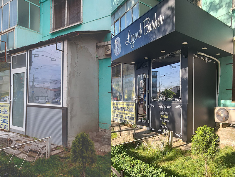 Dna Mary a venit la sediu cu o imagine de pe Pinterest, o idee frumoasă și o locație urâtă. Am comunicat, am pus în practică ideea de bază și am finisat în stil propriu conceptul de ”barber shop” pe care și-l imaginase inițial. Astfel, am transformat un spațiu care nu exista dpdv comercial, într-un reper al zonei.